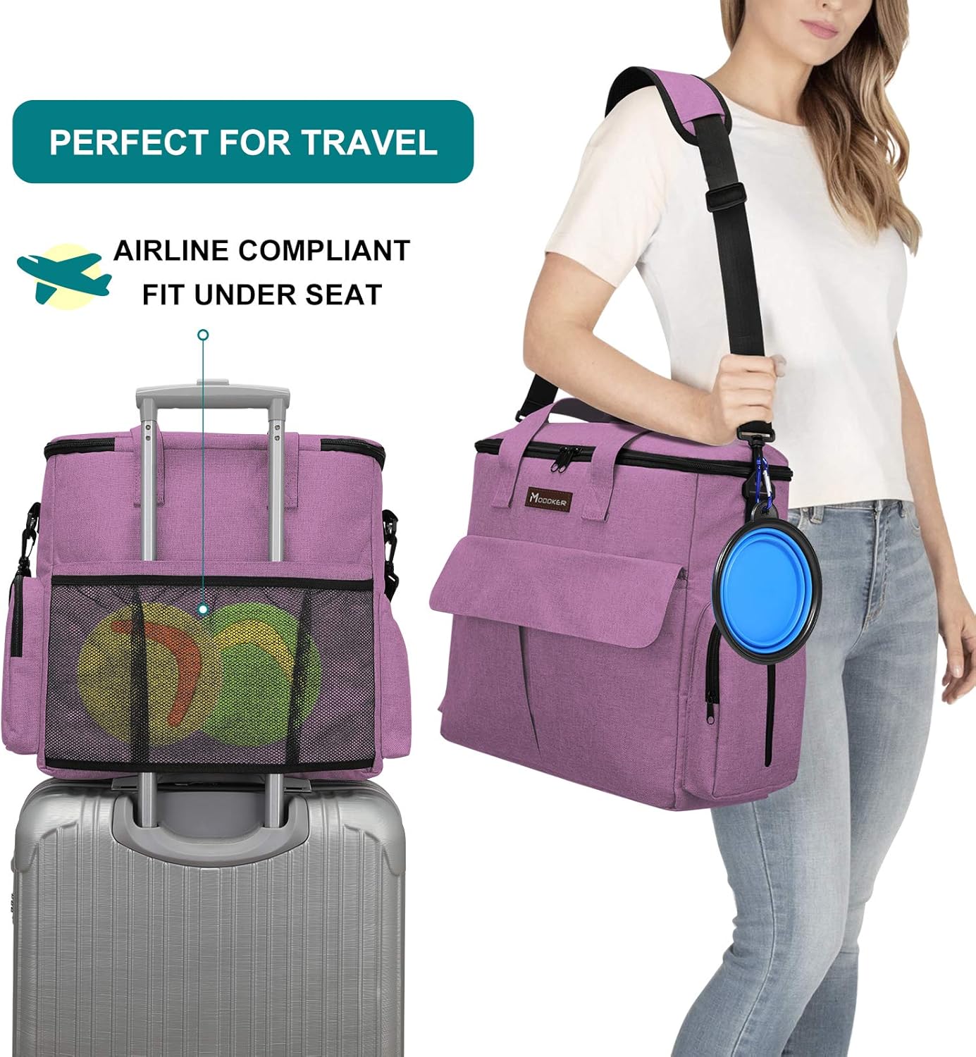 Modoker Dog Food Tote Bag, Airline Approved Pet Gear Travel Set Portable Diaper Accessories Organizer with 2 Food Storage Containers, 2 Collapsible Bowls, 1 Feeding Mat (Pink)