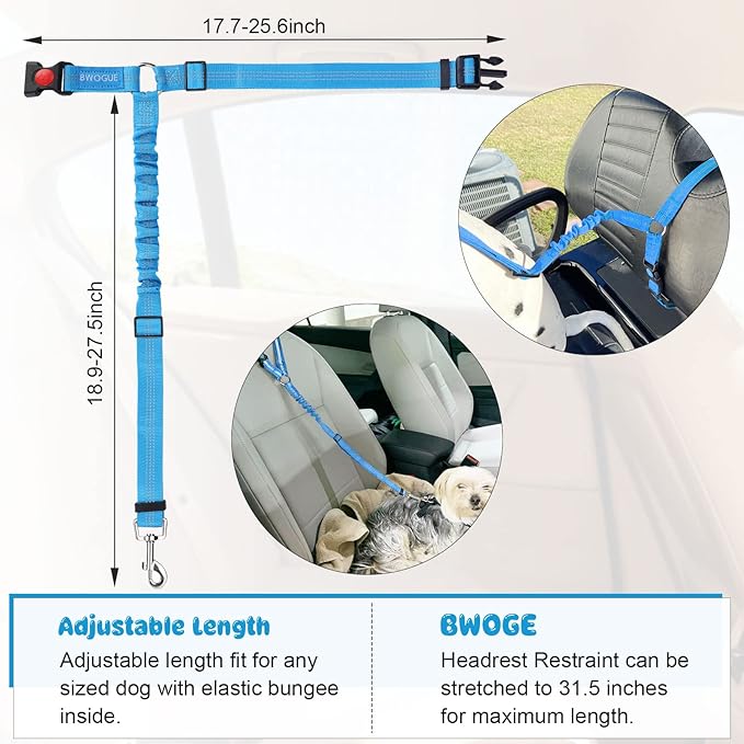 - ADJUSTABLE LENGTH: Dogs come in different sizes and weights. With buckle on the straps and the elastic bungee inside, The BWOGE Headrest Restraint is adjustable between 18.9-27.5 inches and can be stretched to 31.5 inches for the maximum length. The circle can be adjusted from 17.7 inches to 25.6 inches.You can easy to adjust the dog leash to the suitable length to keep your pet in a safety state.