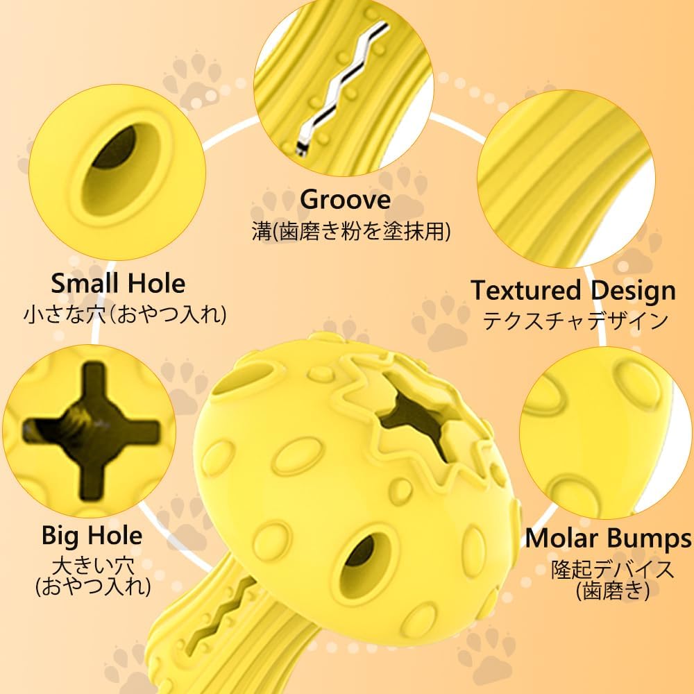 • Teeth Cleaning Toy: There are ridges and bumps on the surface of the mushroom doggy toy and a groove in the stem where you can insert jerky or apply dog toothpaste or peanut butter. It attracts dogs’ interest and helps them clean teeth while teething.