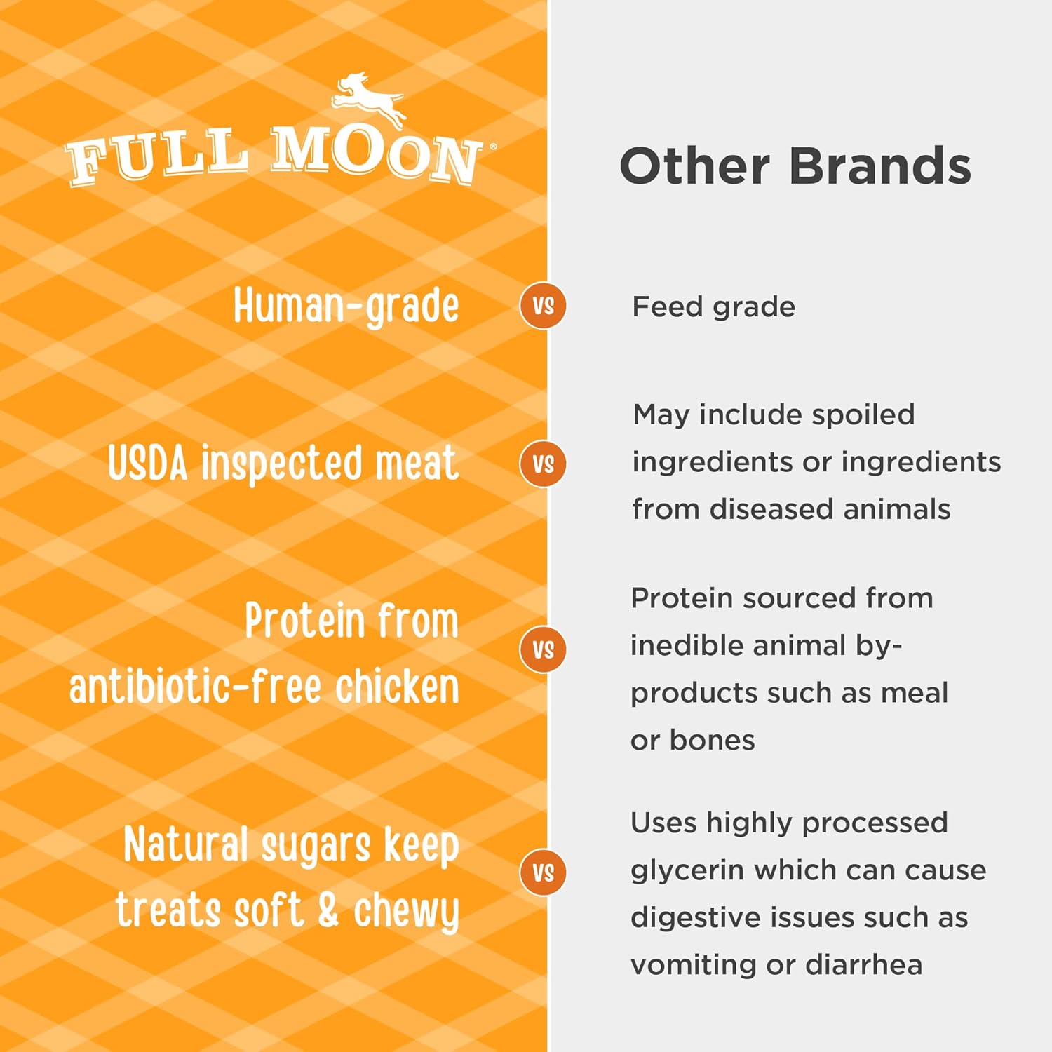 - U.S-GROWN CHICKEN: Full Moon treats are proudly made in the United States using regionally sourced ingredients, including USDA approved, antibiotic-free chicken; No Antibiotics Ever Chicken