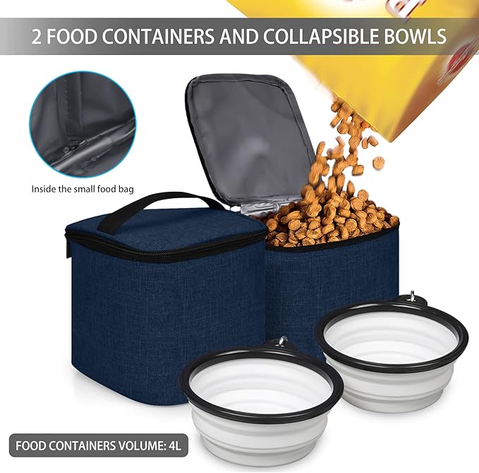 BAGLHER Pet Travel Bag, Double-Layer Pet Supplies Backpack (for All Pet Travel Supplies), Pet Travel Backpack with 2 Silicone Collapsible Bowls and 2 Food Baskets Dark Blue