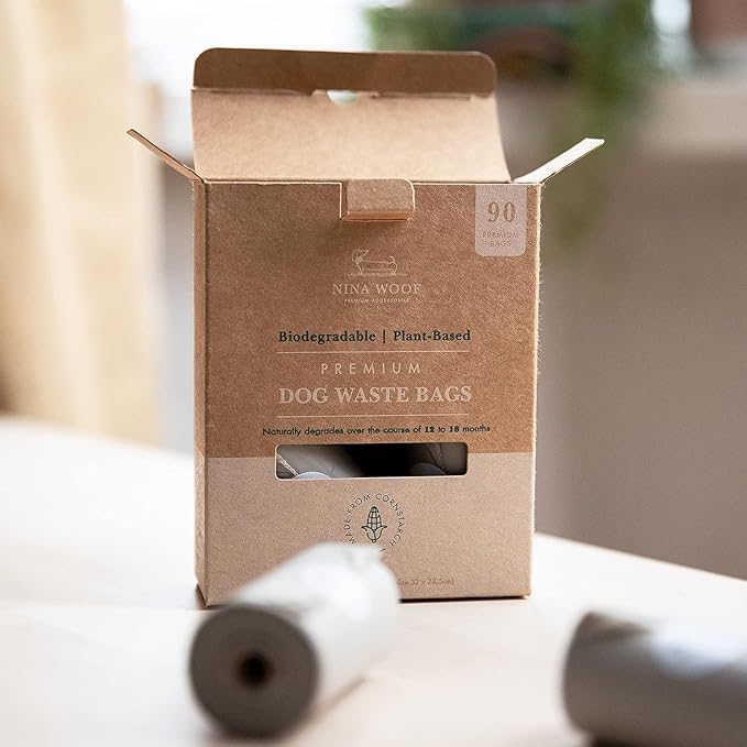 - EARTH SAVER: The Nina Woof certified compostable and biodegradable poop bags are made with plant-based corn starch, free of polyethylene plastic and harsh chemicals, making them friendly to the environment and a safe alternative. To limit the number of cartons needed and the carbon footprint, we built our carton box incredibly light and utilized as few cartons as possible. Try our doggie poop bags and say "No" to plastic bags! dog poop bags rolls