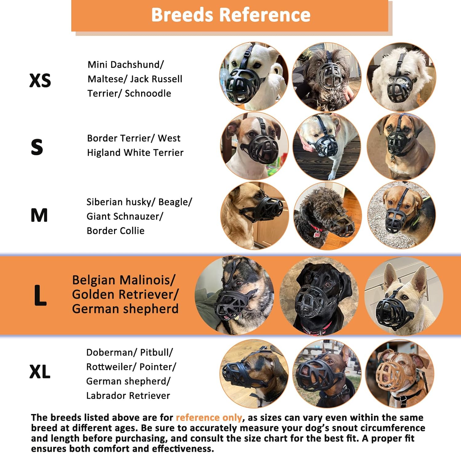- Perfect Fit for Large Dogs: This option Size L large dog muzzle is ideal for large breeds like Golden Retrievers, German Shepherds. The breeds listed above are for REFERENCE only. Be sure to measure your dog’s snout circumference and length accurately before purchasing, and refer to the size chart. A proper fit ensures comfort and effectiveness