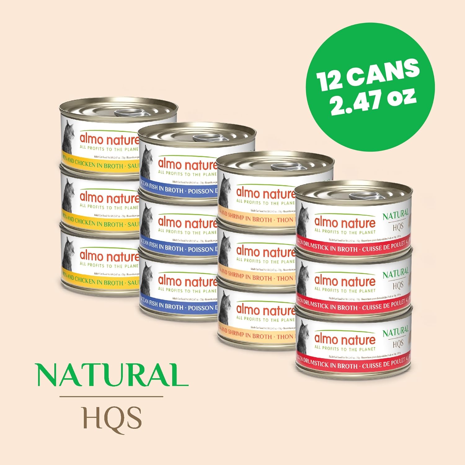 almo nature Wet Cat Food HQS Natural Rotational Diet Fish Selection & Chicken Drumstick - Variety Pack, Grain Free, Additive Free, Highly Digestible, Preservative Free 2.47-oz, 24 Pack