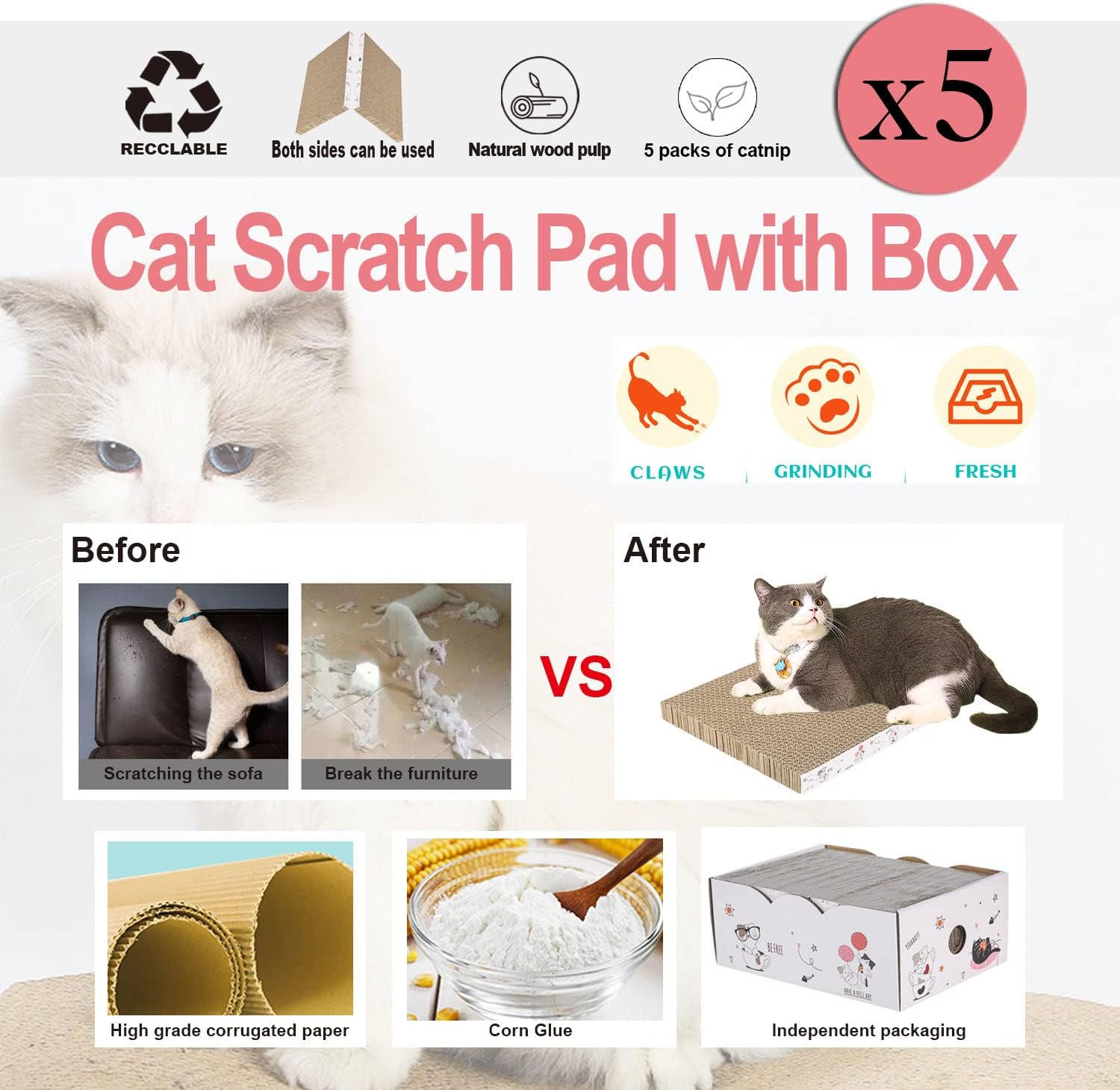 5 Packs in 1 Cat Scratch Pad with Box, Cat Scratcher Cardboard,Reversible,Durable Recyclable Cardboard, Suitable for Cats to Rest, Grind Claws and Play with Scratch Box