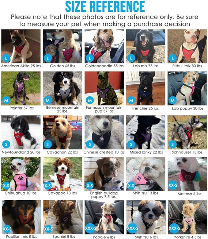 - EASY TO USE AND QUICK RELEASE --- There are two buckle on the chest part, which make the harness easy to put on and no need dogs to step in. And the four adjust buttons on the harness strap, can be easily adjusted to make your fur friend feel comfortable, and suitable for all small, medium and large size dogs, or even kitten cats and medium cats.