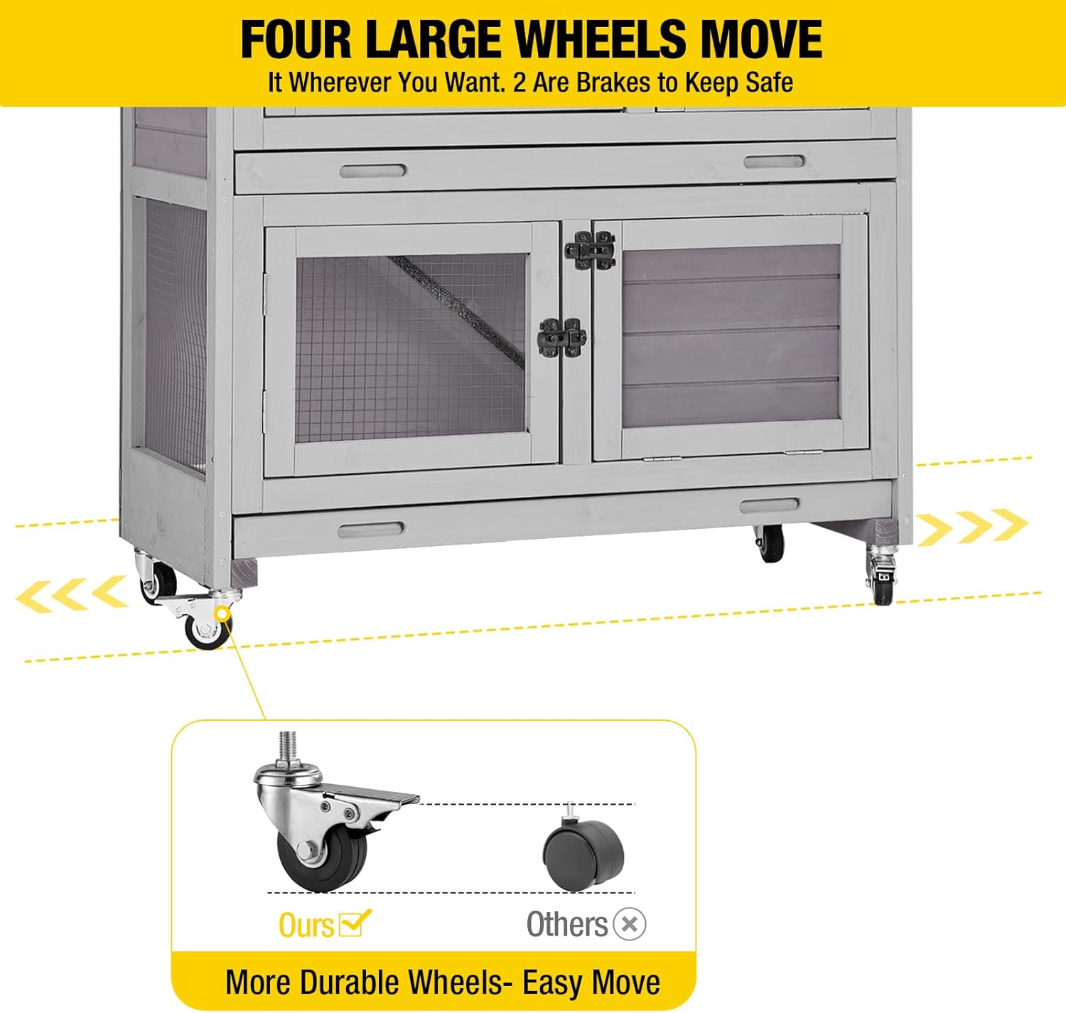 - Easy Movement: Four stronger metal wheels to easily move the rabbit hutch and quickly. Two are brakes to fix well and keep safe