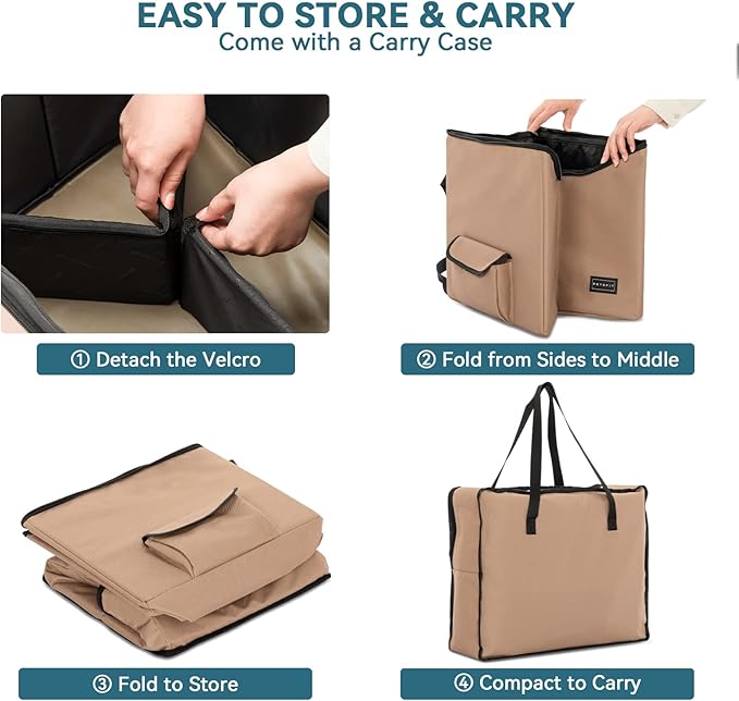 - [Portable Pet Car Seat] The dog booster seat come with a carrying case, making it easy to fold and store when not in use and saving space. The puppy car seat with dimensions of 15" L x 16" W x 14" H, is suitable for both front and back seats in a variety of car types and can be installed or removed in just a few minutes.