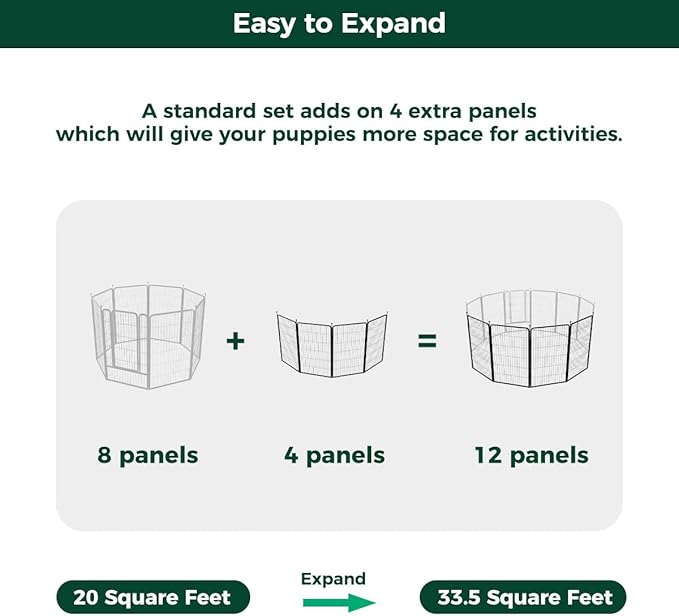 - Super easy to assemble: It won’t take you more than 5 minutes to assemble these portable dog fences as well as pack them away due to the rod-connected design. Meanwhile, panels can be added or removed freely to give you a fully flexible area and arrange the dog pen in any shape you need.
