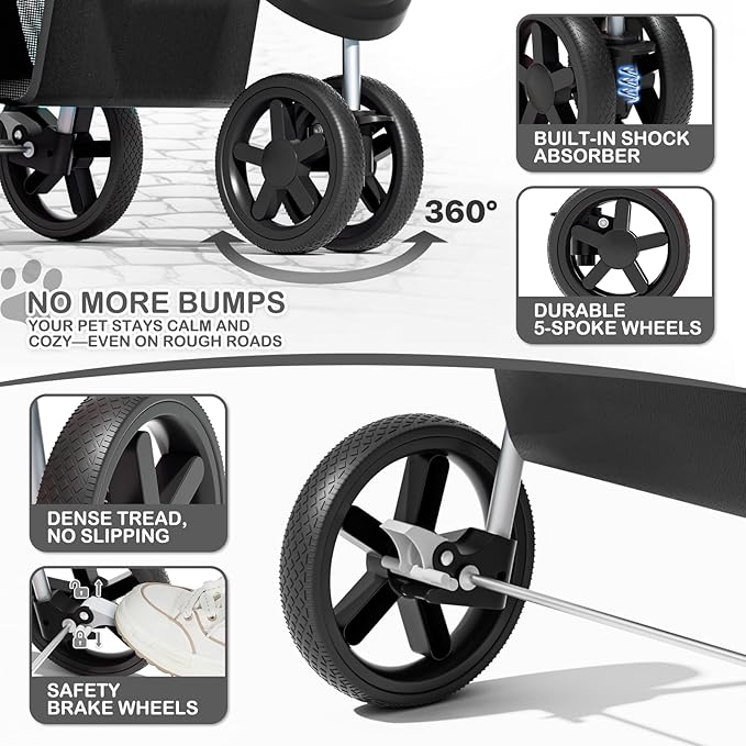 - Flexible Wheels - Finally, the 360° swiveling front wheel with a shock absorber ensures that your pet has a smooth ride even on the roughest terrain. The rear two wheels also feature brakes, making this stroller a perfect fit for injured or senior dogs or puppies that need a little extra TLC.