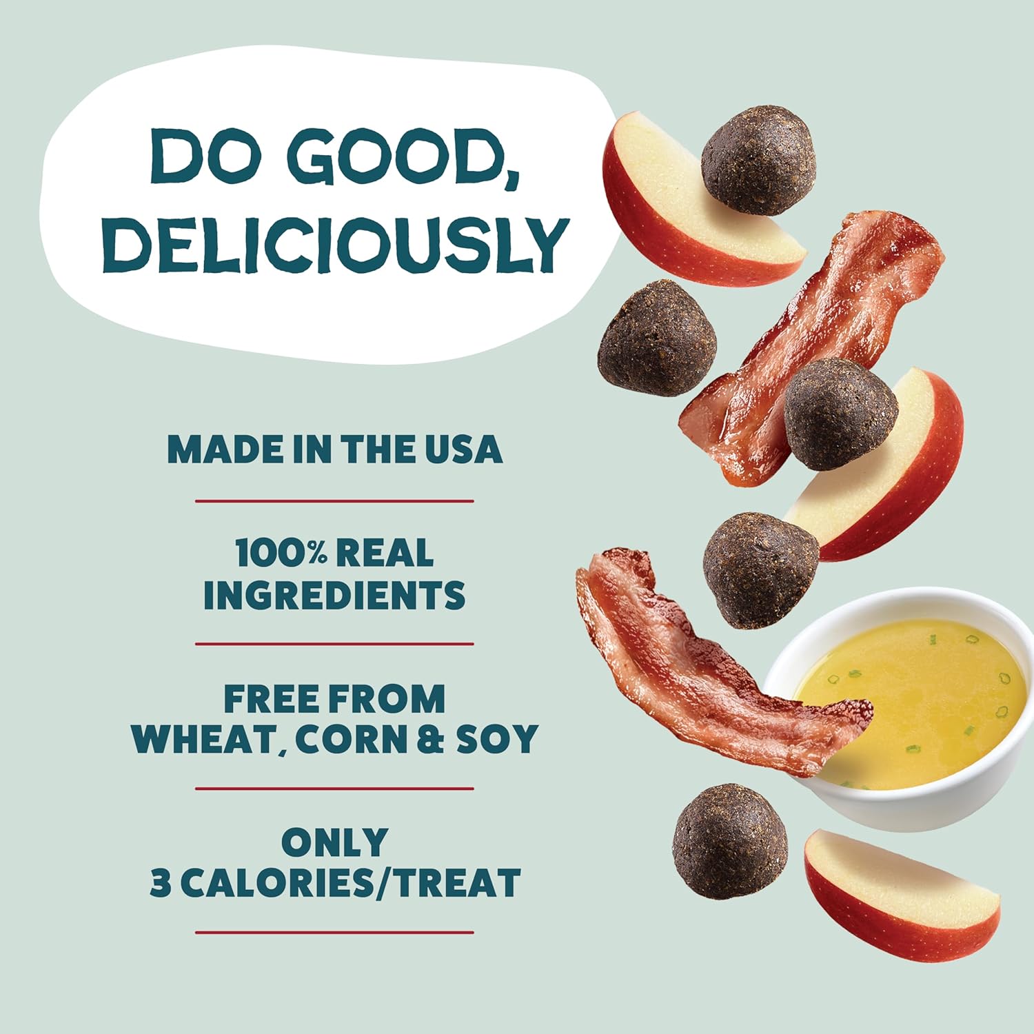 - Whole Ingredients: These high-reward treats are free from corn and soy while loaded with wholesome ingredients like real bacon, pork hearts, pork bone broth, and apple. At only 3 cal/treat, these are the perfect mini to medium rewards for your pup throughout the day. Dogs of all ages, sizes, and breeds can enjoy these firm and chewy treats.!