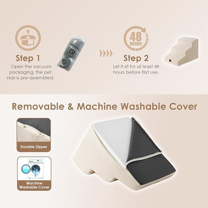 - SPECIFIC AND STEADY DESIGN - 33D density of pure foam make this stair more steady when your pets walk on. The dog bed stairs can provide strong support for pets in the walking process. Low angle slope design can better protect your pet's joints.