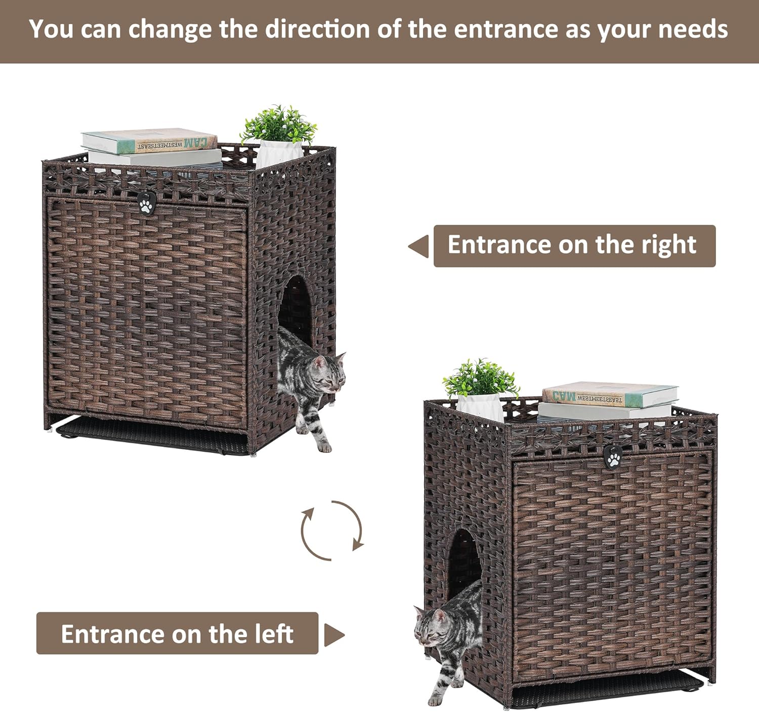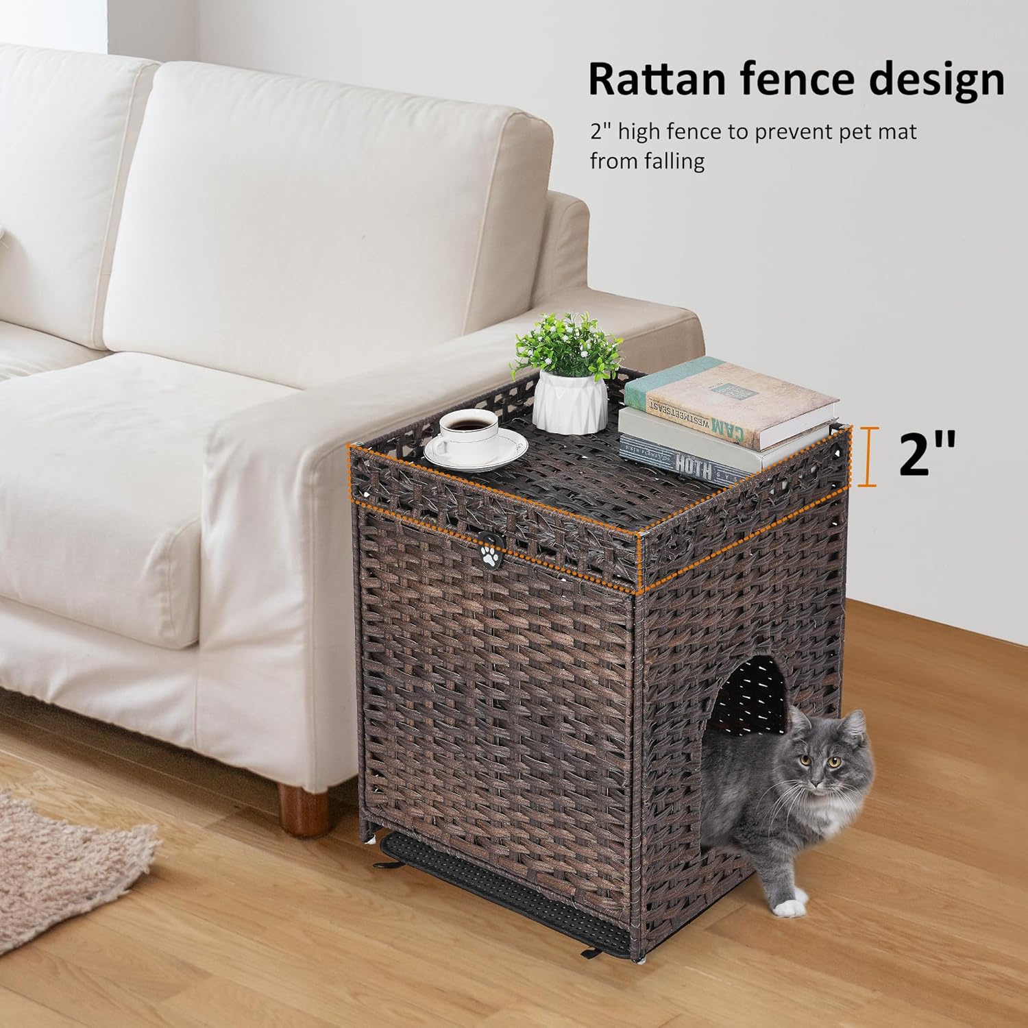 Cat Litter Box Enclosure with Soft Litter Mat; Hidden Cat Washroom Furniture with Door; Handwoven Rattan Cat House; Pet Crate for Living Room, Bedroom, Balcony (Brown)