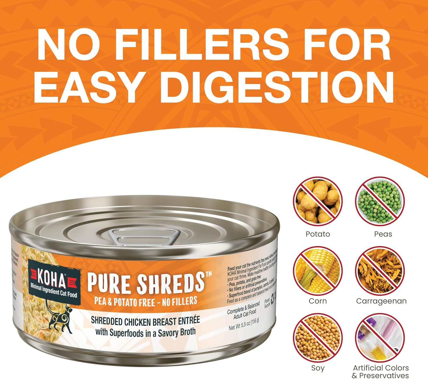 KOHA Pure Shreds Chicken Entrée for Cats, High Protein Wet Cat Food, 2.8oz Cans (Pack of 24)