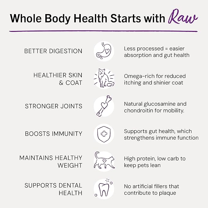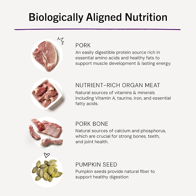 - PREMIUM RAW NUTRITION, CONVENIENT SERVING -- 98% responsibly-sourced pork, organs & bone provides complete, natural nutrition in easy-to-serve morsels. Feed dry as treats, crumble as a topper, or rehydrate with warm water for a complete meal your cat will devour