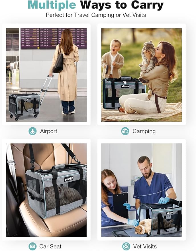 - Well Ventilated: This cat carrier with wheels has multiple breathable mesh windows for optimal airflow and maximum visibility. With top and side openings, the pet can get in and out of the bag easily.