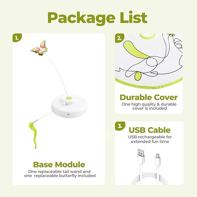 - 360° Rotating Butterfly: The automatic butterfly rotates 360°, creating an exciting chase experience. Flashing lights and spinning motion captivate your cat, mimicking real prey for the thrill of the hunt. Ideal for indoor cats, this feature ensures they stay active and entertained even when alone.