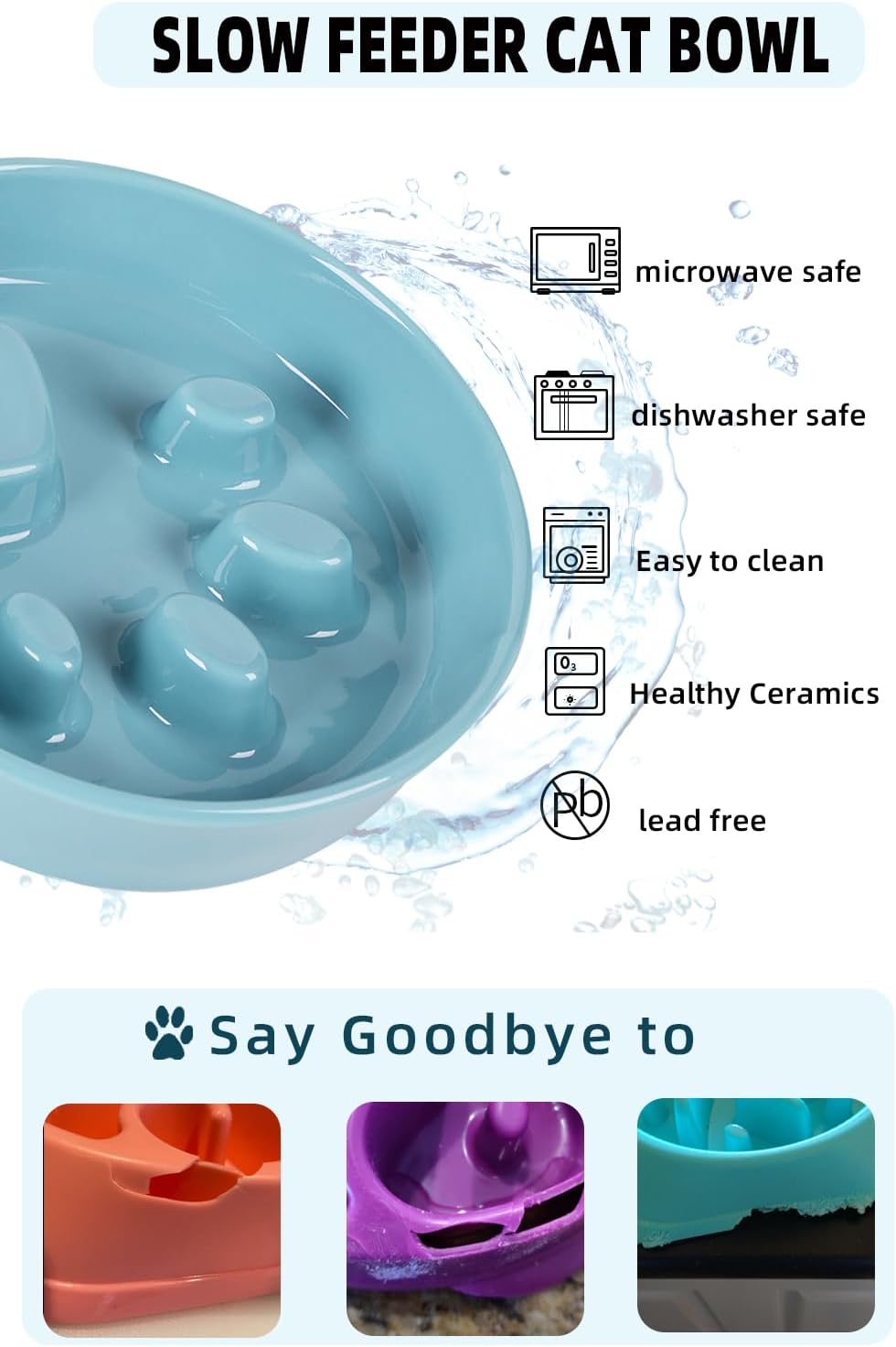 Slow Feeder Cat Bowls, Ceramic Fun Slow Eater Bowl for Cats (Turquoise)