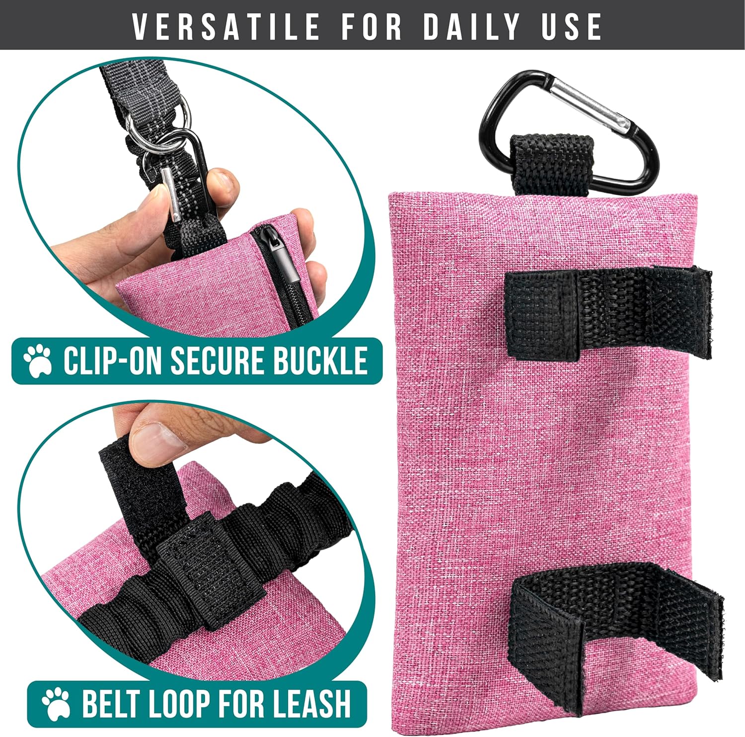 - POOP BAG DISPENSER FOR LEASH: Poop bag holder clips and attaches to any leash or velcro secures to your dog's harness. Perfect pet essential dog walking pouch with zipper storage to hold dog accessories, small treats and extra poop bag rolls.