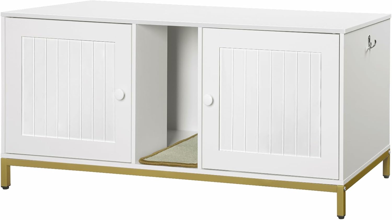 HOOBRO 44" Cat Litter Box Enclosure for 2 Cats, Double Cat Litter Box Furniture Hidden, TV Stand Litter Box Enclosure with Cat Scratching Mat, Cat House, Cat Washroom Cabinet, White, Gold DW20MW01
