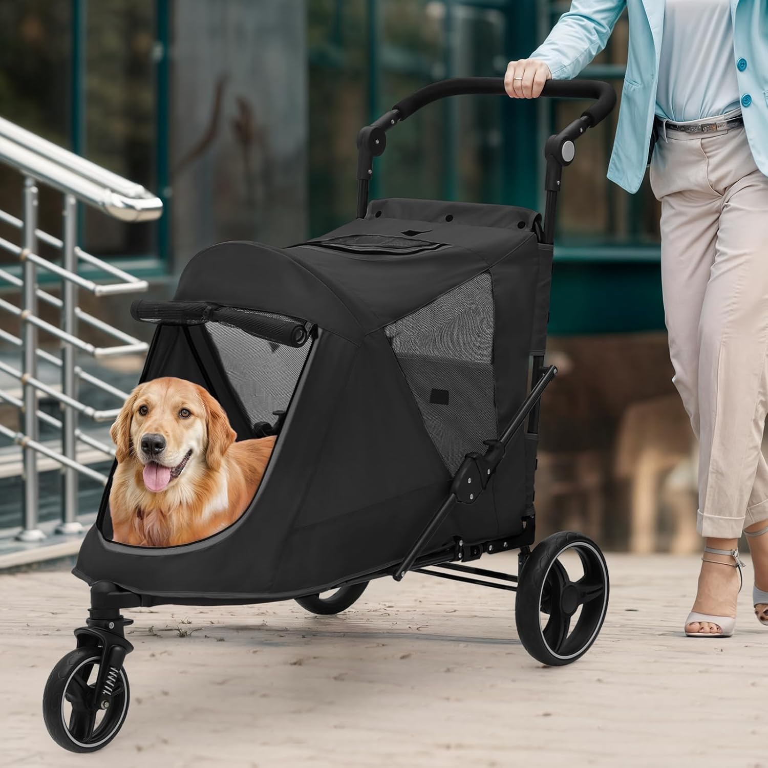 Magshion Pet Stroller for Medium Dogs w/Adjustable Handle, 3-Wheel Dog Cat Wagon w/Dual Entry, Rear Storage, Breathable Mesh, One-Foot Brake, Ideal for Large Pets up to 55 lbs, Black