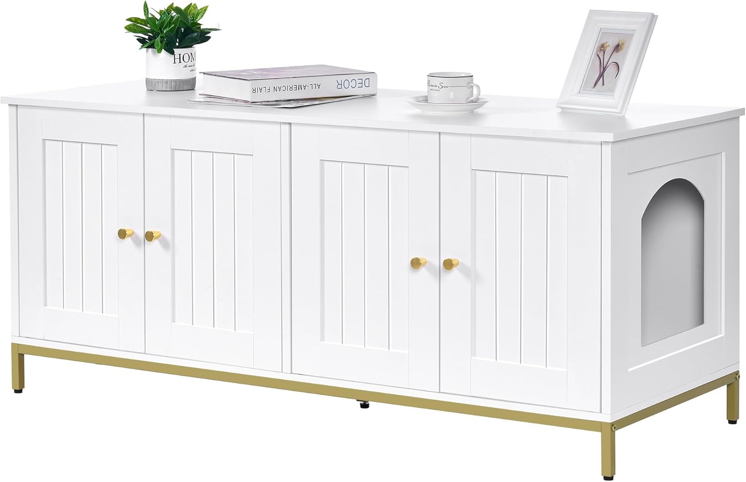 - Modern style: The cat litter box cabinet features white finish and metallic gold-colored metal frame, adding an elegant and stylish touch to your home decor. Its minimalist design and exquisite detailing inject a touch of luxury and sophistication into your living space