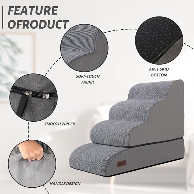 4-Step Dog Stairs and Ramp for Beds or Couches – Non-Slip Sturdy Pet Steps for Small Dogs and Cats,21" H,Grey