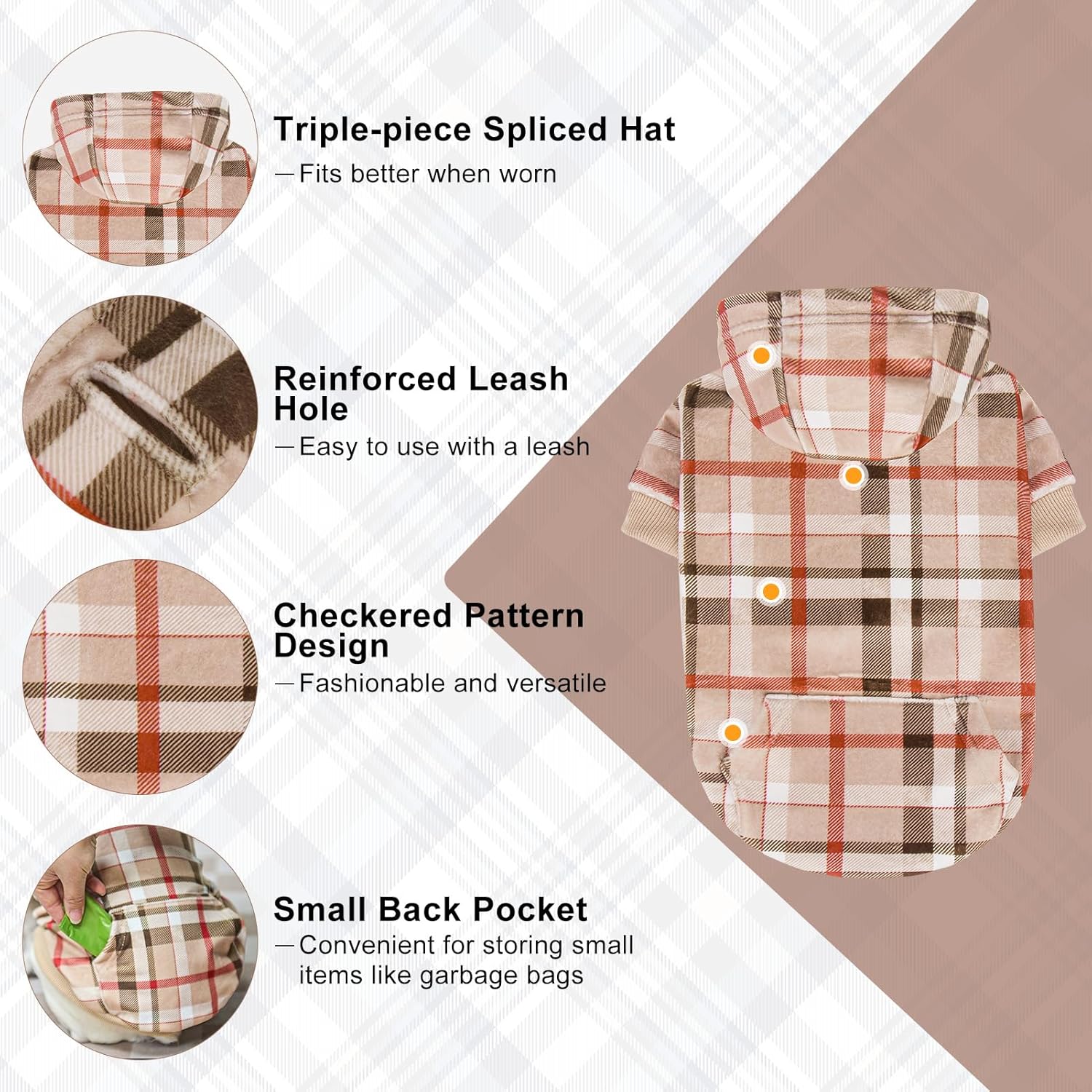 - Stylish & Practical Look: This plaid dog hoodie boasts a classic vintage check pattern that makes your pup stand out! Includes a handy back pocket for storing treats, toys, or waste bags. reinforced leash hole adds safety and durability—perfect for walks, running, hiking, training, or festive occasions like Christmas, Thanksgiving, photo shoots, and birthday parties.