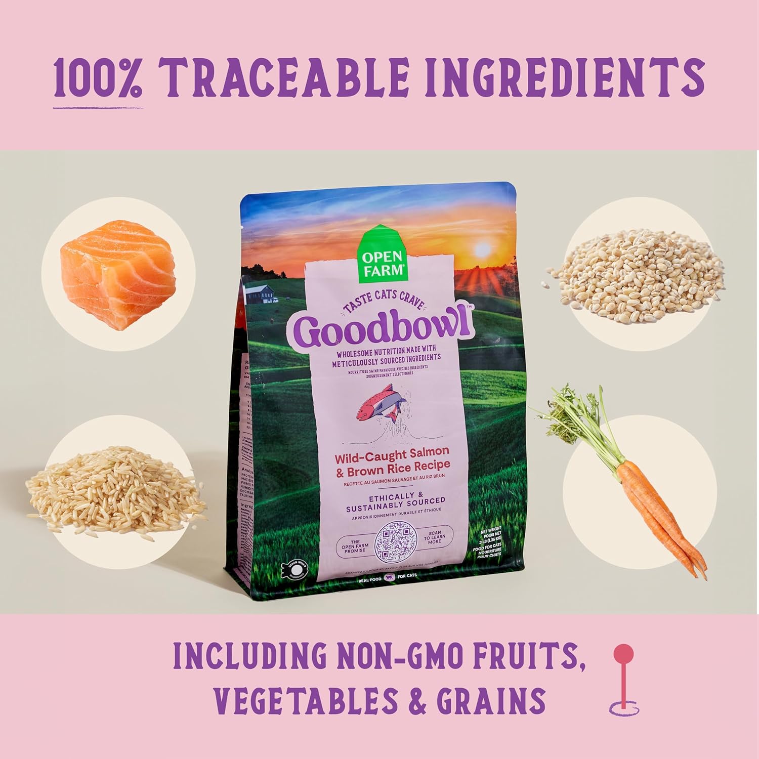 Open Farm Goodbowl, Protein Rich Dry Cat Food Made from Meticulously Sourced Simple Ingredients, Wild-Caught Salmon & Brown Rice Recipe, 3lb Bag (48oz Bag)