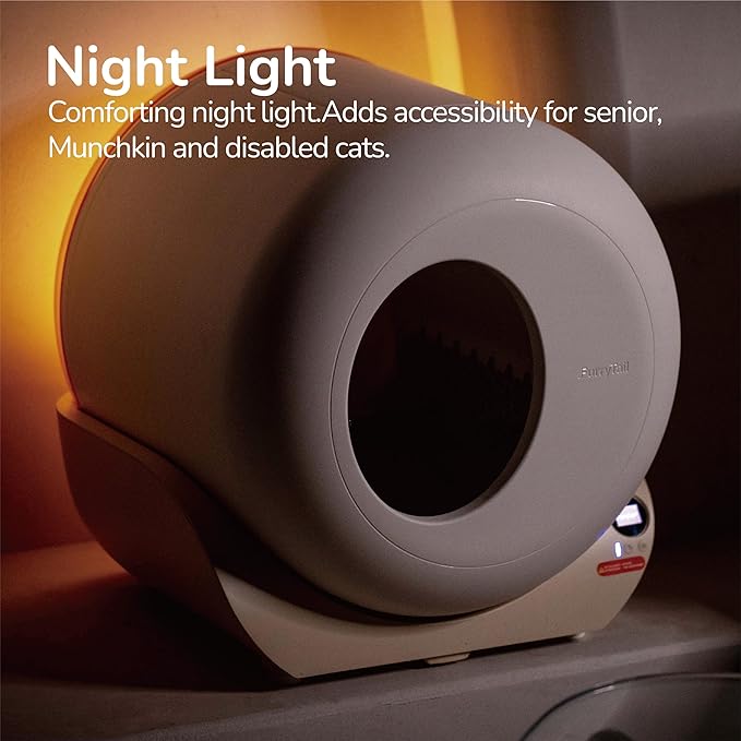 - 【Smart Safety Features】Multiple sensors keep your cat safe. Proximity and weight sensors pause a cleaning cycle when a cat approaches, or is inside the litter box. The adjustable ‘night light’ and low-entry design adds accessibility for senior, Munchkin, and disabled cats.