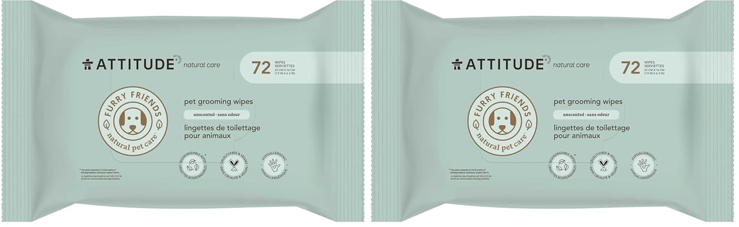 ATTITUDE Pet Grooming Wipes, Hypoallergenic Plant and Mineral-Based Ingredients, Vegan and Cruelty-Free Biodegradable Products, Unscented, 72 count (Pack of 2)
