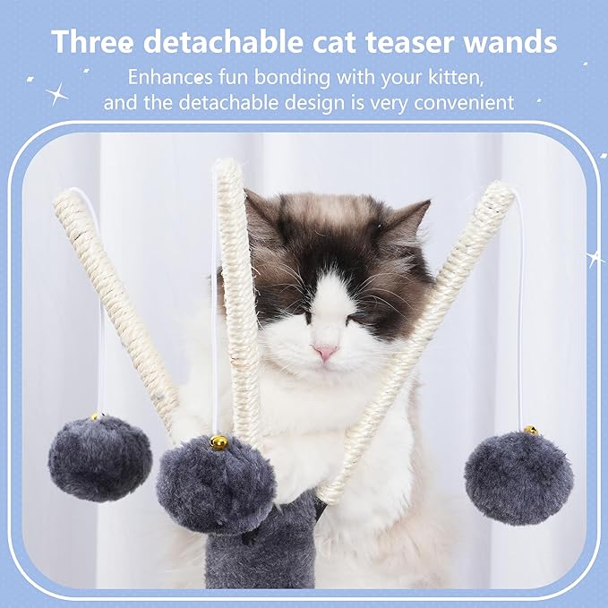 - 3 Removable Teaser Wands: The toys can be detached to interact with cats, and also can be installed back on the cat tree for independent feline fun. The rod body is wrapped with sisal, which increases the kitten's interest in playing