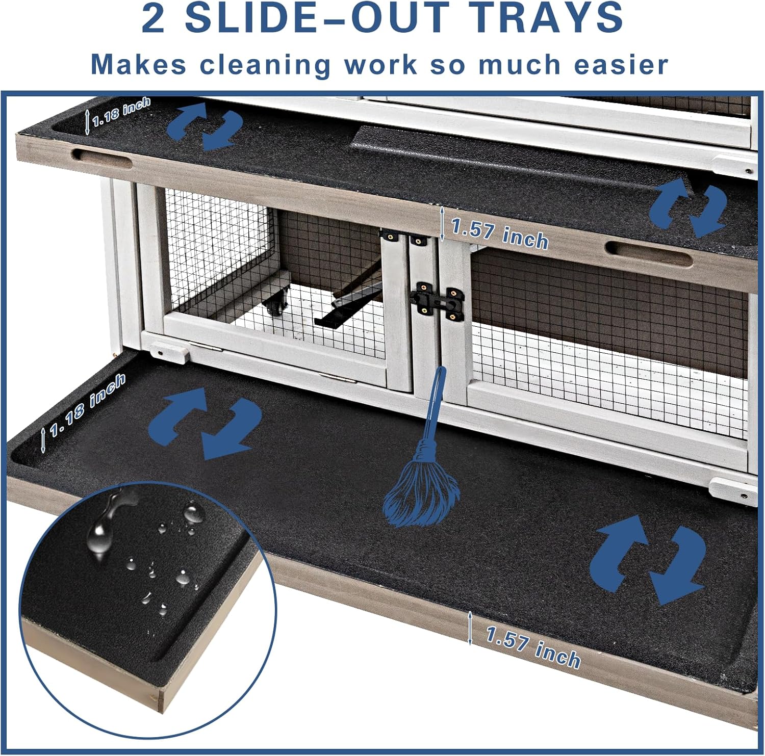 - 🐹【2 PULL OUT TRAYS & EASY TO MOVE】Say goodbye to messy cages and hello to easy maintenance! The bunny hutch is equipped with two deep no-leak trays that simplify cleaning, ensuring a clean and healthy living environment for your pets. Featuring four lockable metal wheels, this rabbit cage is easy to move, allowing you to provide your pets with a change of scenery indoors and outdoors. Whether you want to bring them closer to you or let them enjoy fresh air and sunshine, this cage offers the flexibility you need.