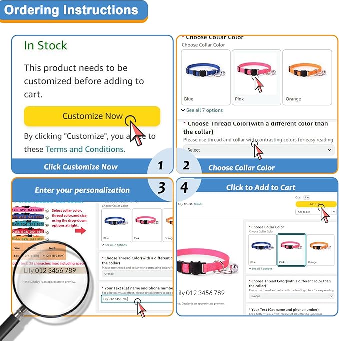 - 【Customize Now】To order this collar, please click "Customize Now" and enter: (1) collar color: black, orange, red, blue, pink, etc. (2) thread color, (3) collar text: pet name and phone number - up to 25 characters. After completing the collar customization, click "Add to cart".