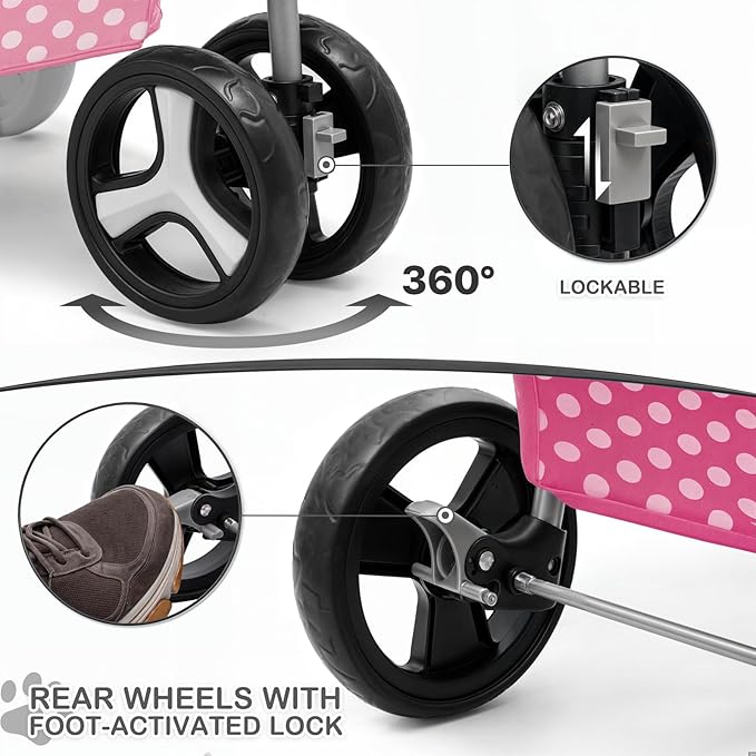 MoNiBloom 3 Wheels Pet Dog Cat Stroller for Small Medium Dogs Cats, Foldable Jogger Stroller w/Storage Basket and Cup Holder, Hot Pink Polka Dots