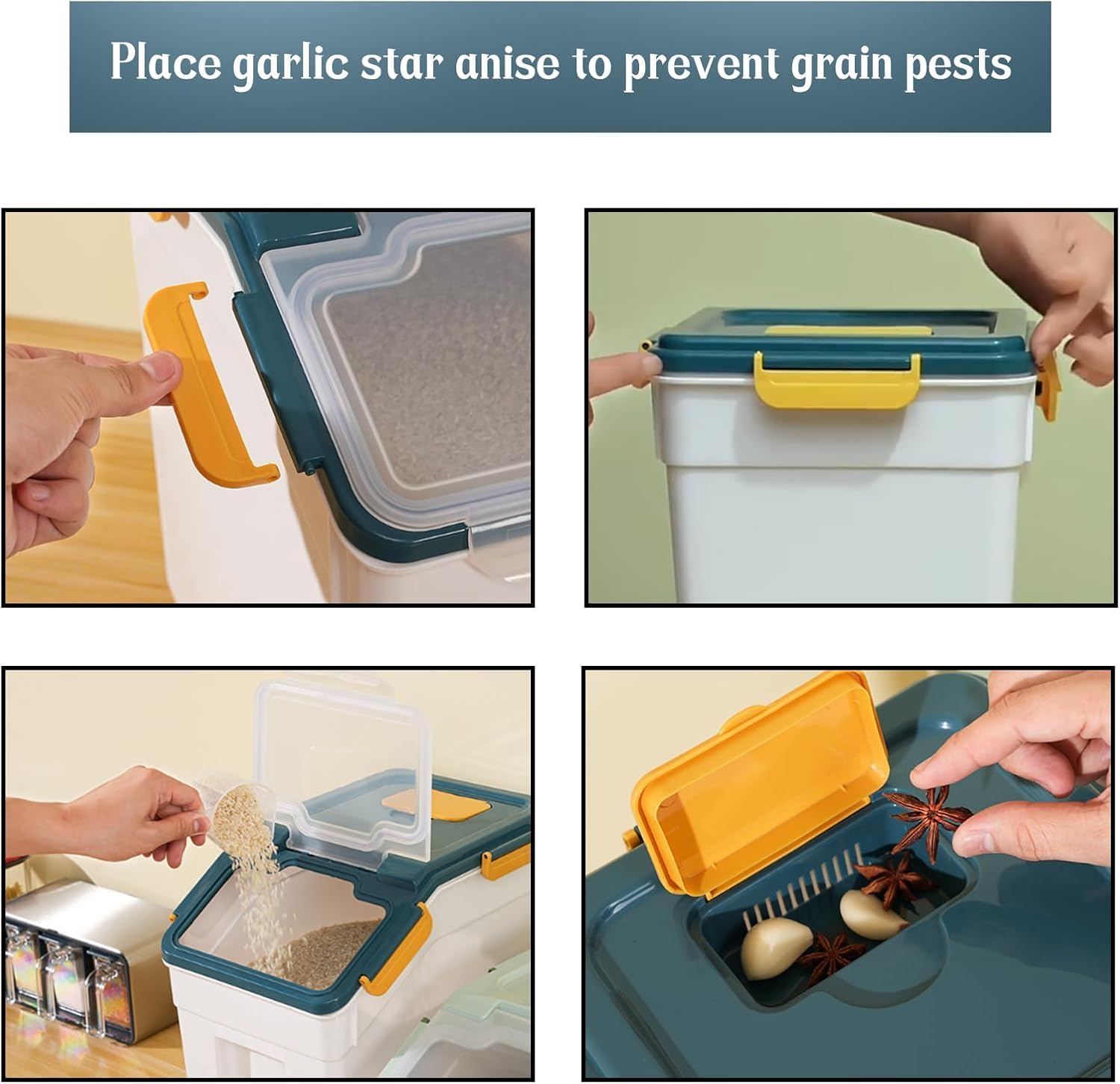- Multi-purpose rice storage container is a great way to store any type of food and keep it safe and dry.The airtight food container it is suitable for storing flour, grains, cereal, sugar, rice, nuts, beans, snack, coffee, tea, bread, corn, pasta, herbs, pet food, soybeans, dry goods, etc.