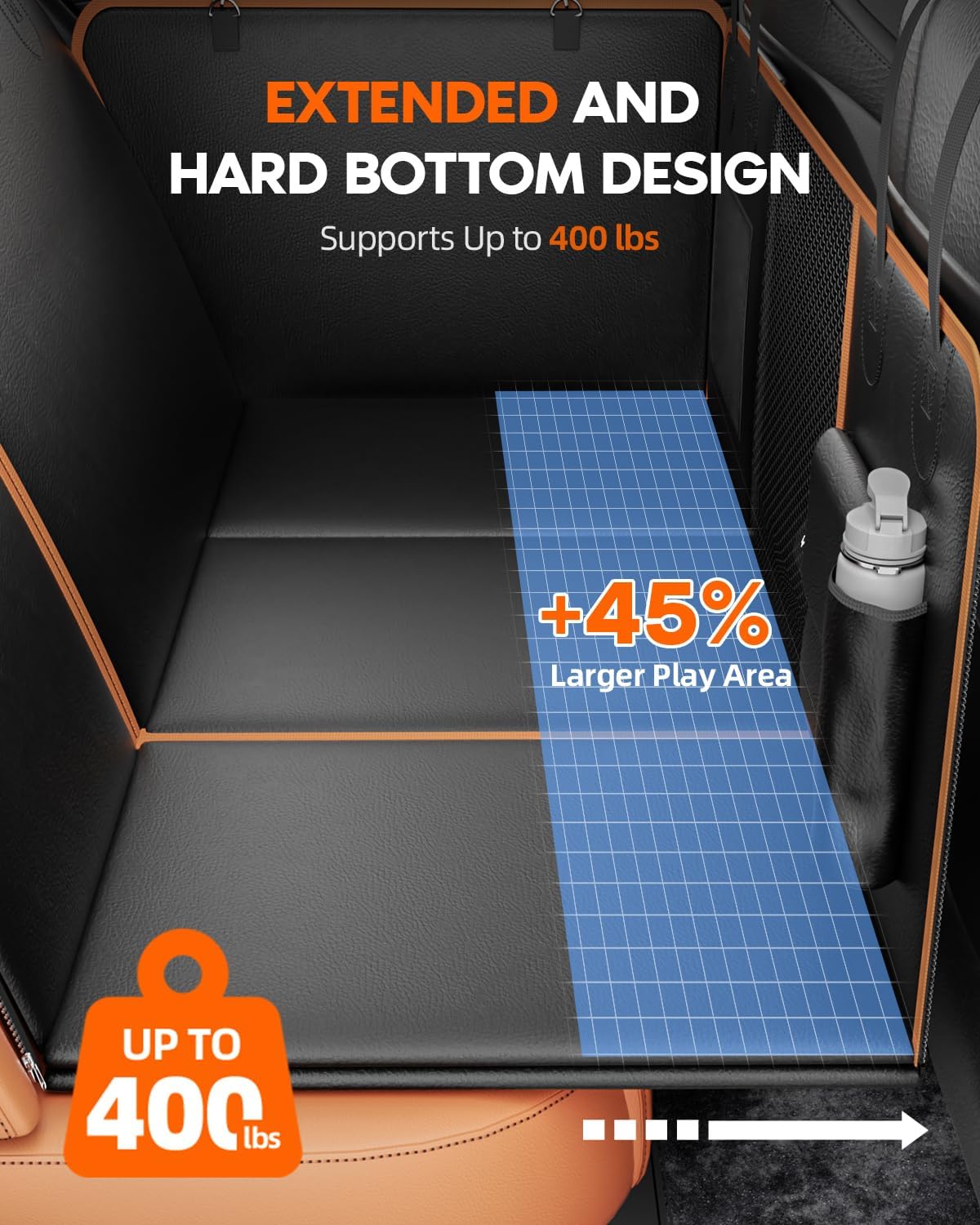 - 【Hard Bottom Extender Design for Safety and Comfort】The Back Seat Extender for Dogs is 45% longer than traditional carseat covers, featuring a reinforced base with a weight-bearing panel that supports up to 400 lbs. This prevents your pet from sliding into the footwell during sudden stops, ensuring a secure and comfortable ride. Ideal for medium or small dogs, puppies, and even other mascotas