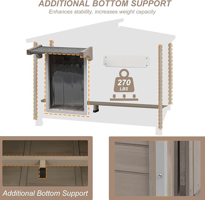 - 【ELEVATED RAISED FEET & ALL-SEASON PROTECTION】This dog house is designed with raised feet to keep your pet dry and comfortable by protecting them from moisture. The door features PVC curtains that help eliminate drafts and improve airflow, while the flip-up window allows you to adjust ventilation according to your pet's needs. The asphalt roof and detachable PVC curtains provide effective protection against wind and rain, ensuring the house is suitable for various weather conditions.