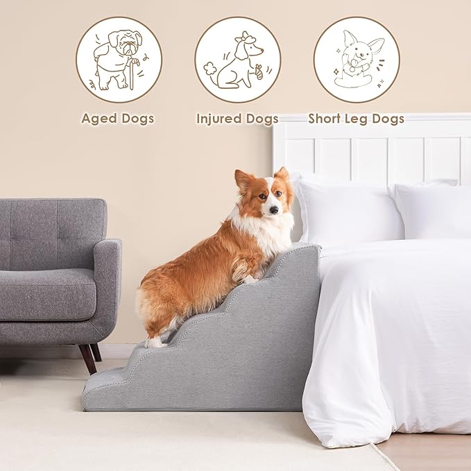 - SPECIFIC AND STEADY DESIGN - 33D density of pure foam make this stair more steady when your pets walk on. The dog bed stairs can provide strong support for pets in the walking process. Low angle slope design can better protect your pet's joints.