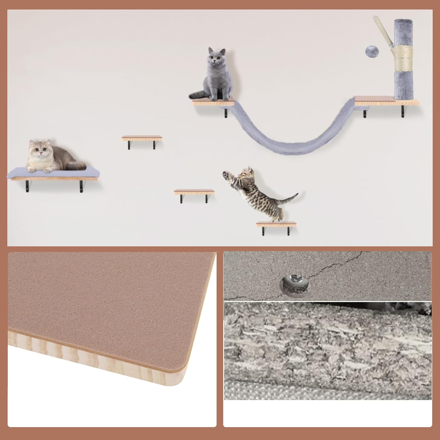 - MULTIFUNCTIONAL: The cat wall shelves set is the ideal activity center for your cat, it includes a cat scratching post, cat hammock, cat jumping board, cat sofa, steps and hanging ball, providing a wealth of entertainment options for your cat. This wall mounted cat climber set allows your cat to explore, climb and play to their heart's content and fulfill their natural instincts