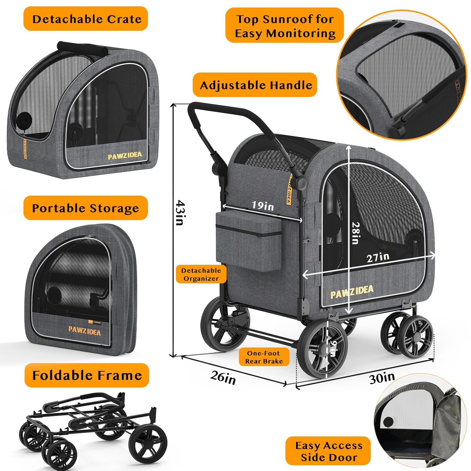 PAWZIDEA Dog Stroller for Large Dogs, Pet Stroller with Detachable Carrier for Portable Dog Crate for Car Seat, Foldable Dogs Jogger Strollers, All Terrain 9” Wheels, Adjustable Handle, Up to 80lbs