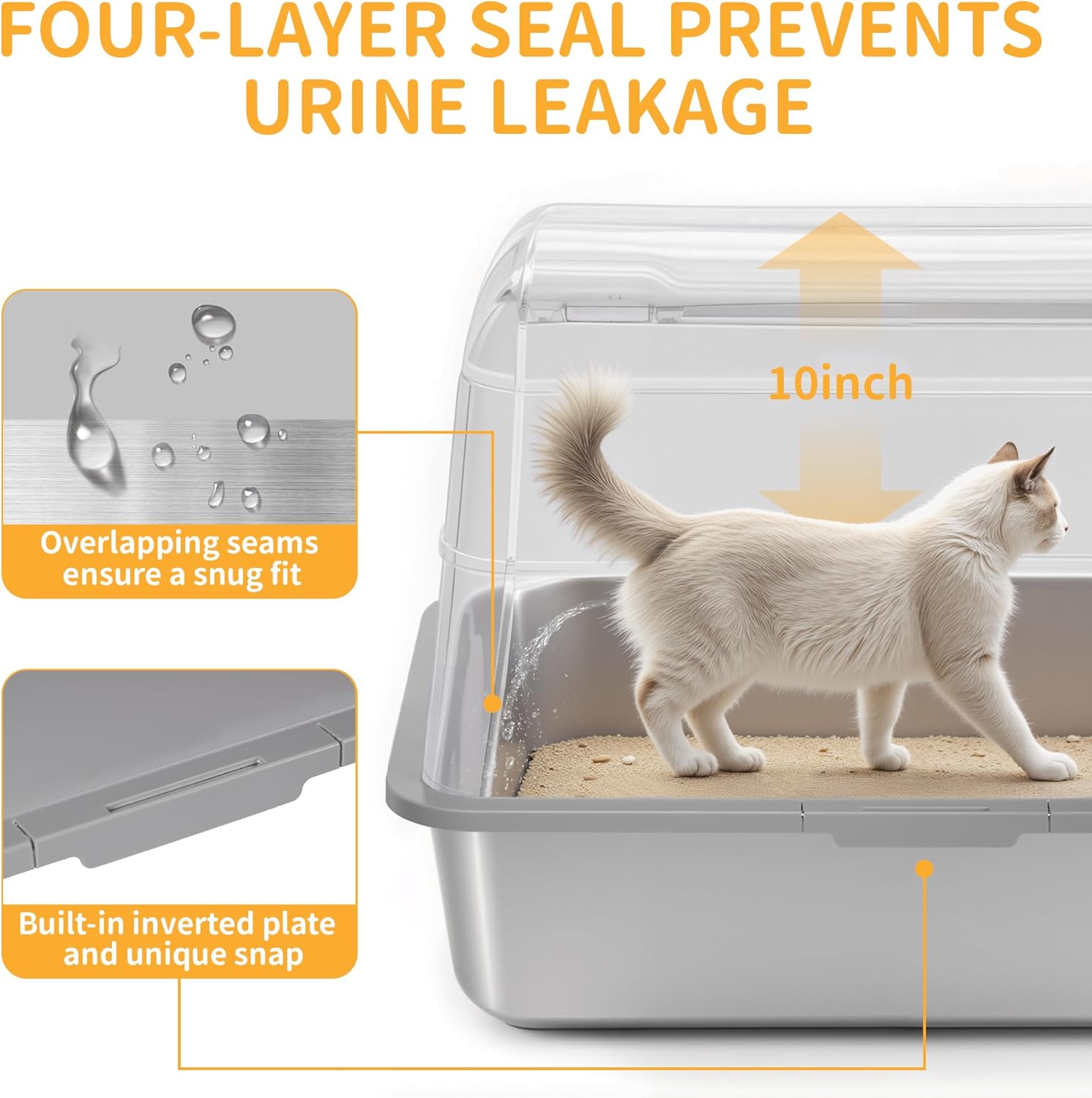 - 【Your Ideal Stainless Steel Litter Box 】 Extra-large stainless steel cat litter box, its large capacity suits cats of all sizes. The 6 - inch high - side and 4 - inch top cover, ensure 100% urine - proof. Our metal cat litter box is easy to clean, it doesn’t hold odors or cling to waste.