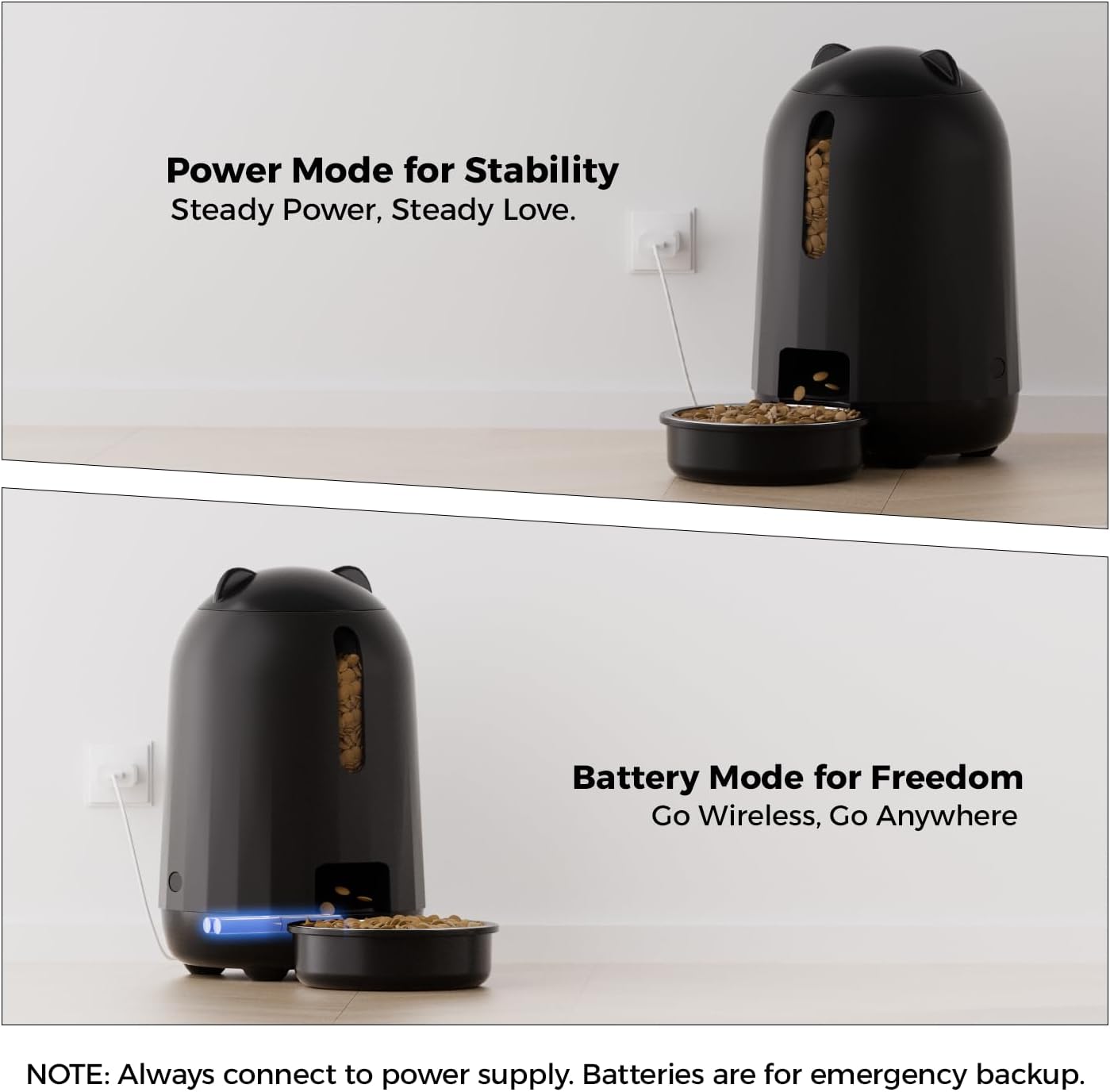- 【DUAL POWER SUPPLY, NO WORRIES ABOUT POWER OUTAGE】PAPIFEED cat automatic feeders supports dual-mode power supply: plug-in + backup battery (4 AA batteries, not included). It automatically switches to backup power when power outages occur, ensuring that cats eat on time and owners can go out with more peace of mind. Tips: It is recommended to maintain dual power supply mode for daily use to ensure that the backup battery is always charged to cope with sudden power outages.