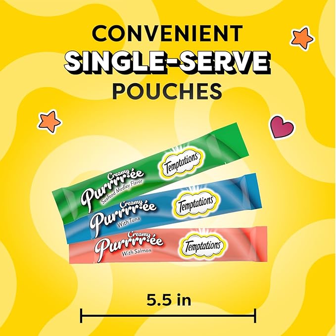 Temptations Creamy Puree Mix-Ups Squeezable Lickable Wet Cat Treats, Tuna Flavor, Salmon Flavor, and Seafood Medley Flavor, 0.42 oz. Tubes, 48 Count