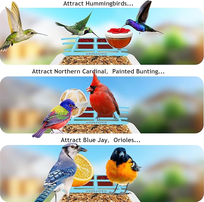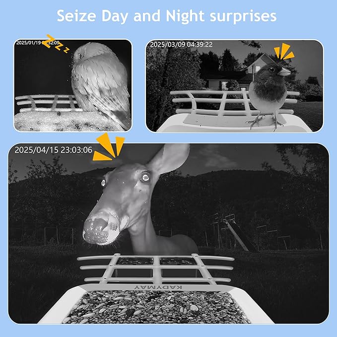 - Cloud Storage & 64GB TF Card: Provide remote cloud storage & 64GB TF card local storage for Kadymay bird watching kit. Also works like security cameras with Kadymay smart bird feeder with camera wireless outdoor. NOTE: TF card can store real-time video via motion detection WITHOUT NETWORK