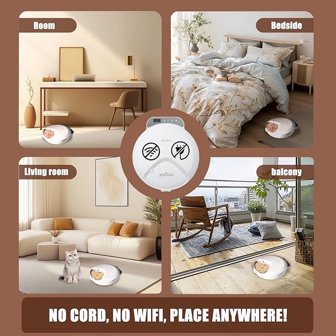 - SAFETY DESIGN: This smart automatic food dispenser for cats and dogs does not need to be plugged in, so you can place the feeder anywhere and don't have to worry about kittens tripping over cords or the food tray not working due to a power outage. In addition, the kitten feeder has an anti-kick safety design that stops running immediately when you catch your pet's behavior and won't resume running until your pet retracts his or her paws and claws