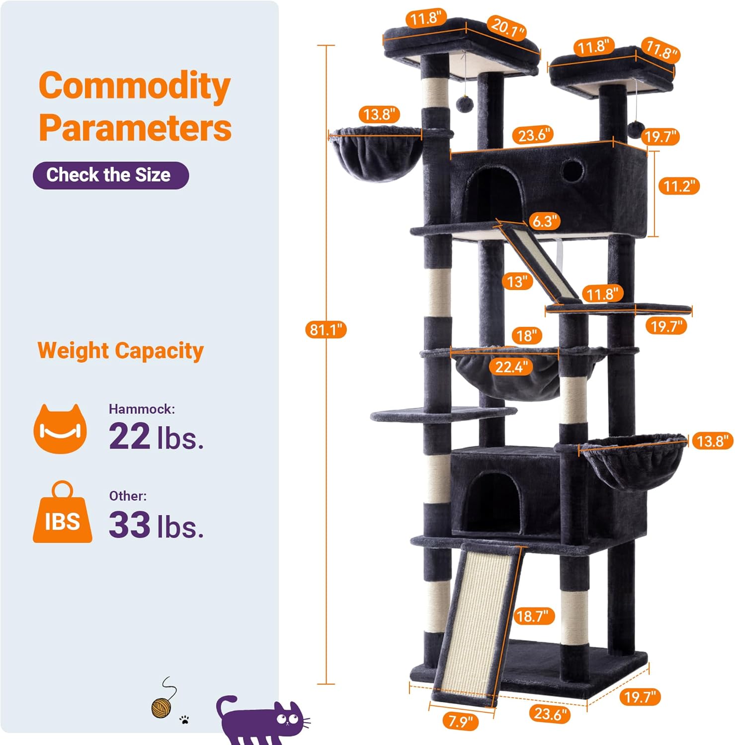 - Multifunctional Activity Center: This cat tree offers various functions for cats, including 2 perching platforms, 2 comfortable condos, and an oversized hammock. Whether climbing, resting, or scratching, the cat's needs are met