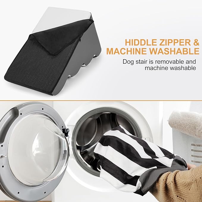 - REMOVABLE AND WASHABLE COVER: The ultra-soft, machine-washable cover on dog stairs for bed simplifies maintenance. Simply unzip and wash the outer layer (avoid washing the foam core). Perfect for dog steps for high bed users, this feature keeps hygiene effortless in busy households