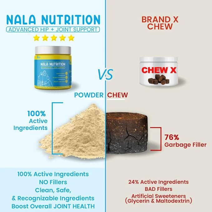 - EFFECTIVENESS: Nala Nutrition is proven to be more effective than other "chew" brands. While others contain mostly harmful fillers, Nala Nutrition only includes 100% RECOGNIZABLE ingredients.
