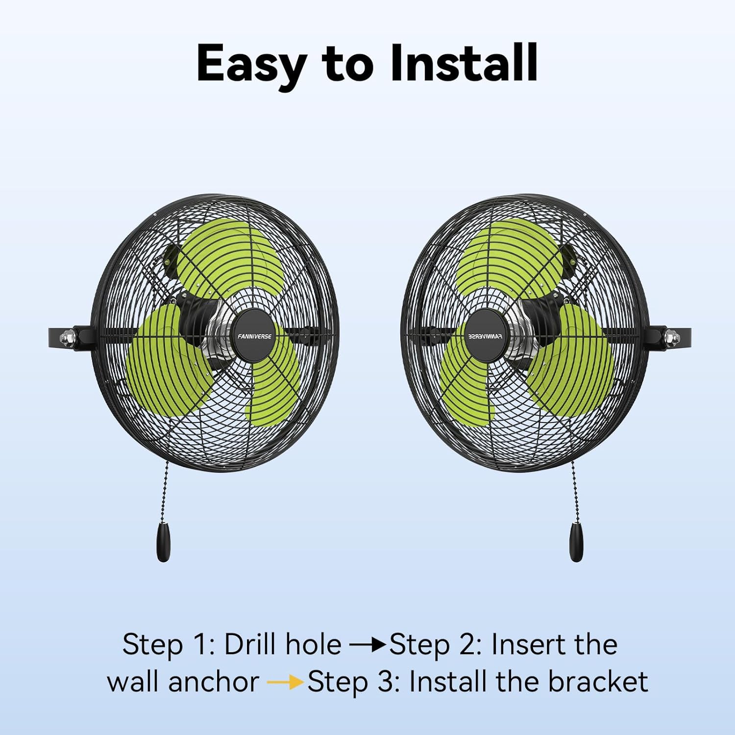 - Durable Constructions: Fanniverse wall mounted fan is made from tough powder coated steel housing and thick rust-resistant grille. Premium TEAO ball bearing motor. Extra-long 6 FT SJT waterproof power cord with 2 storage hooks. 0.55 AMPS, 2800 CFM, 120V, 62 Watts, 60 Hz, 1/10 HP. Meets OSHA and UL507 standards. UL safety listed.
